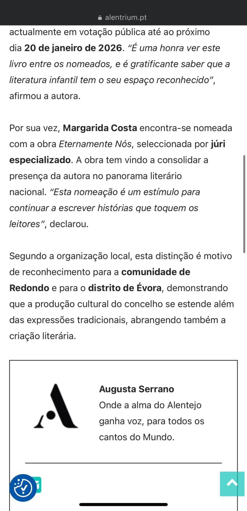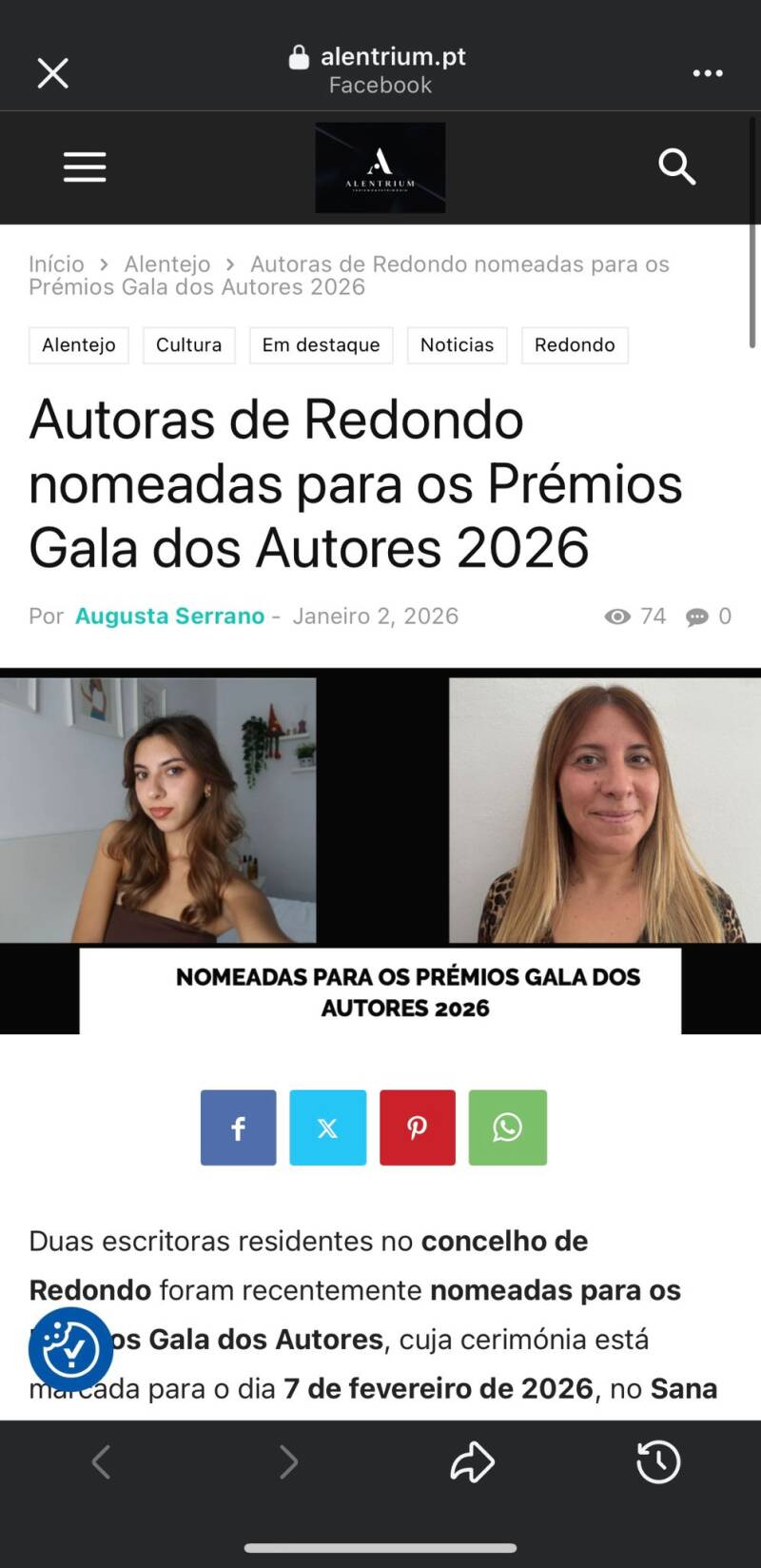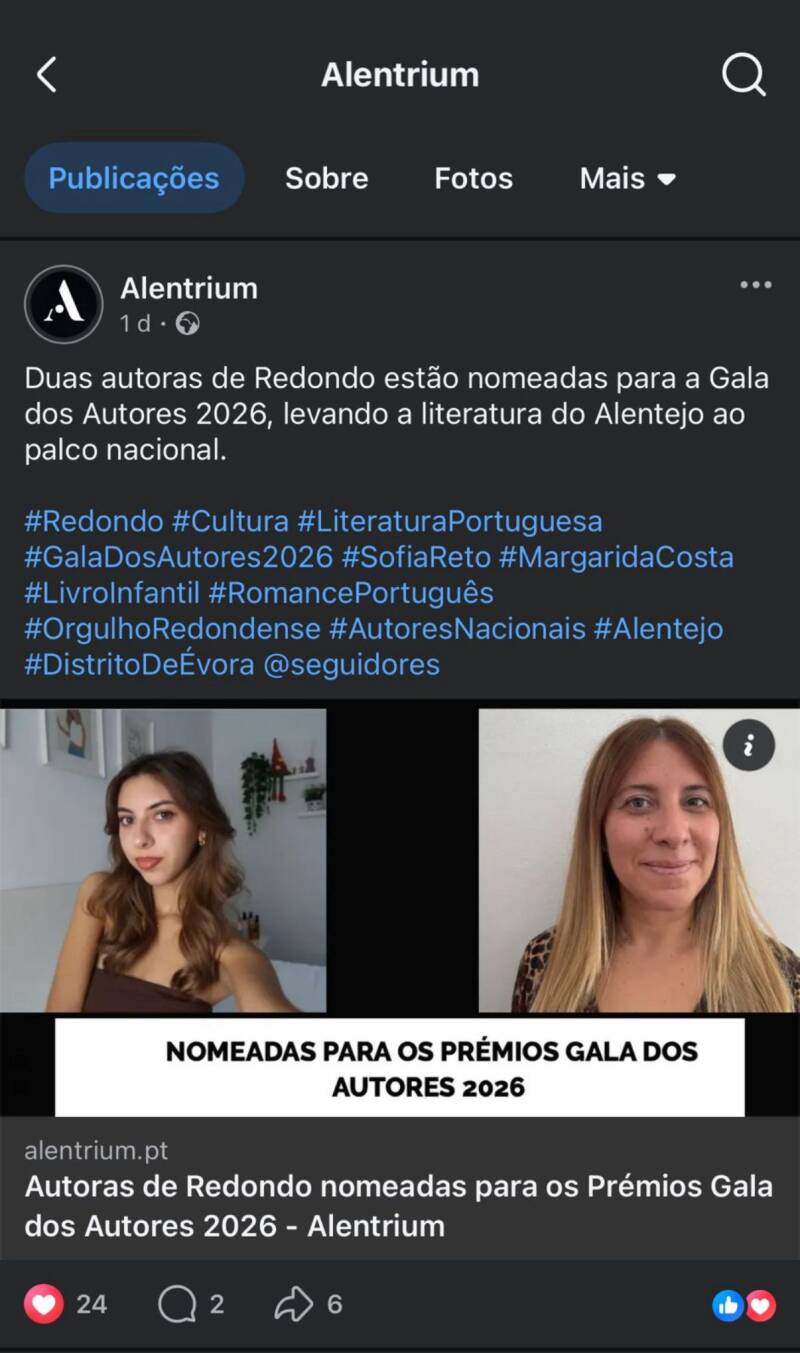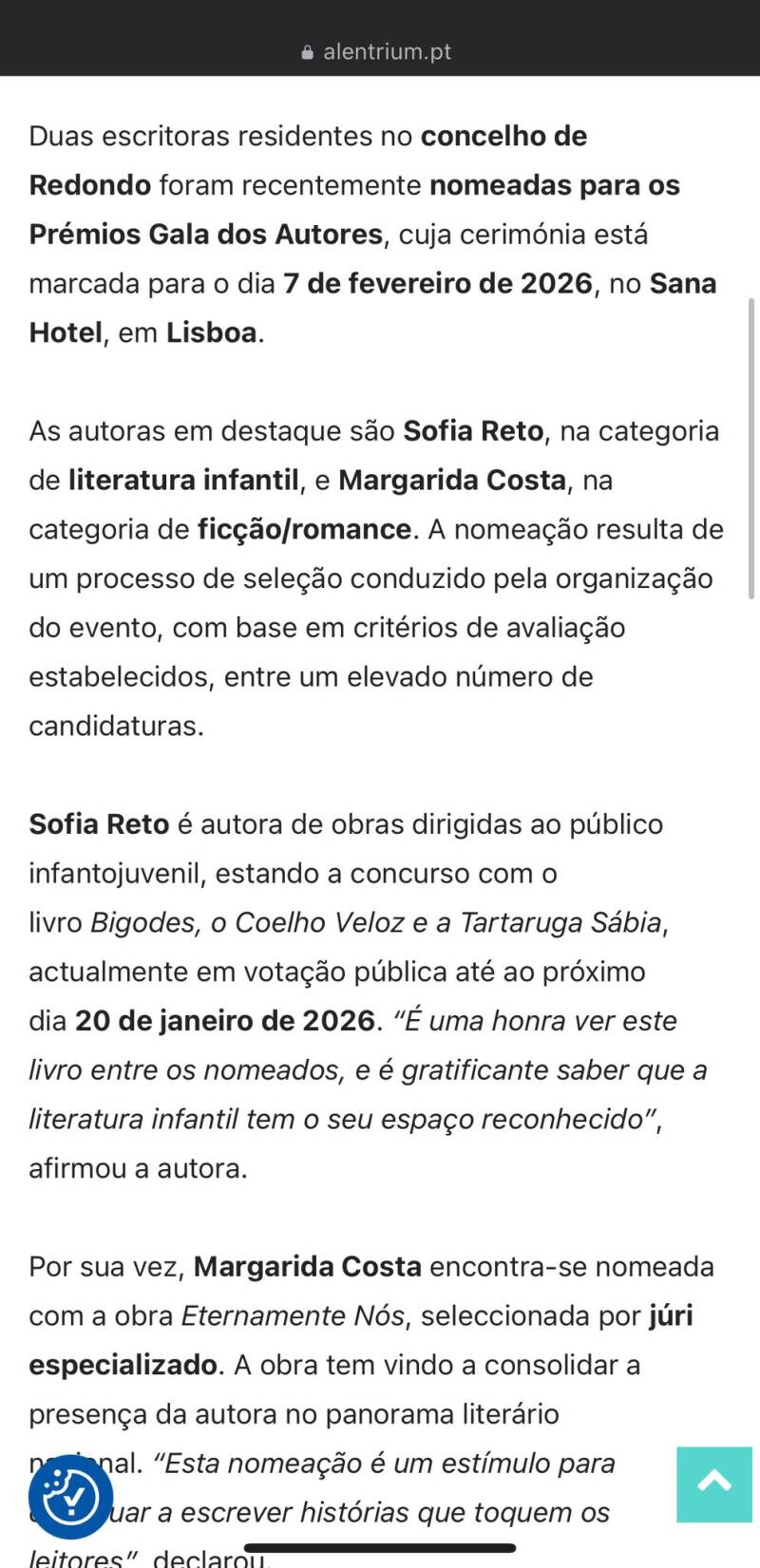 A notícia dá destaque à nomeação de Sofia Reto na categoria Escolhas do Público da Gala dos Autores 2026, promovida pela editora Cordel d’Prata e Meia Longa, reconhecendo o seu trabalho enquanto autora e a sua ligação ao Alentejo. Esta referência pública representa um momento de grande orgulho, não apenas pelo reconhecimento literário, mas também por ver o seu percurso valorizado num contexto cultural mais amplo.